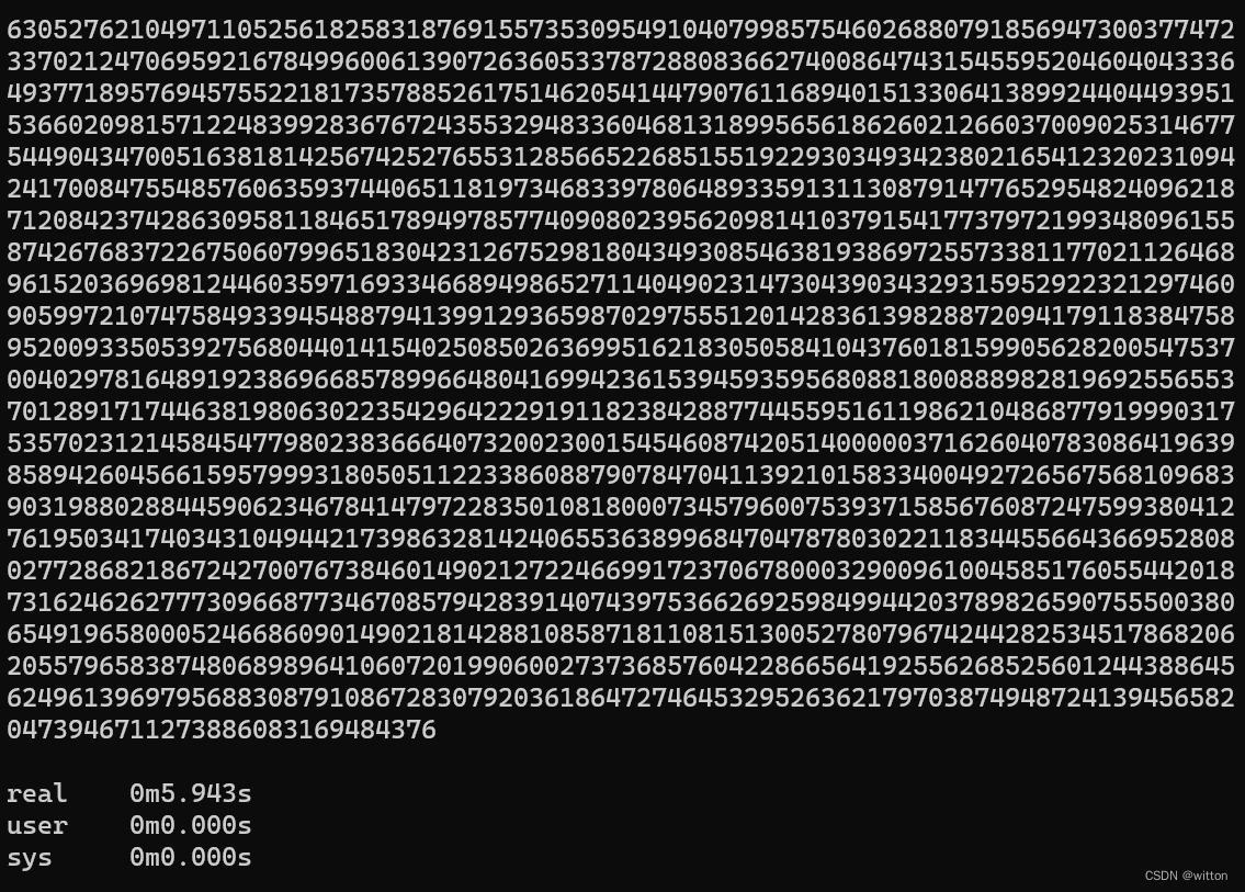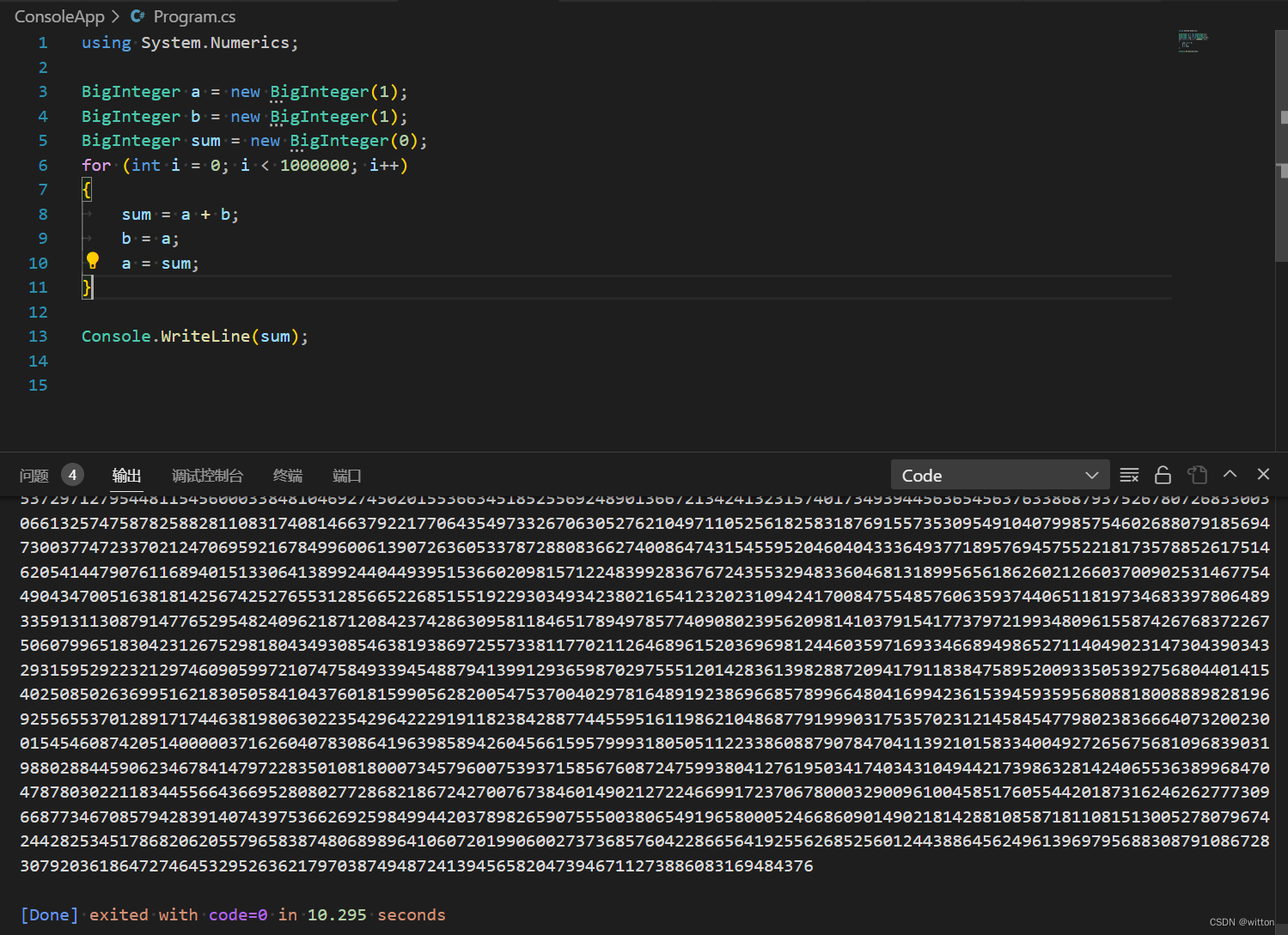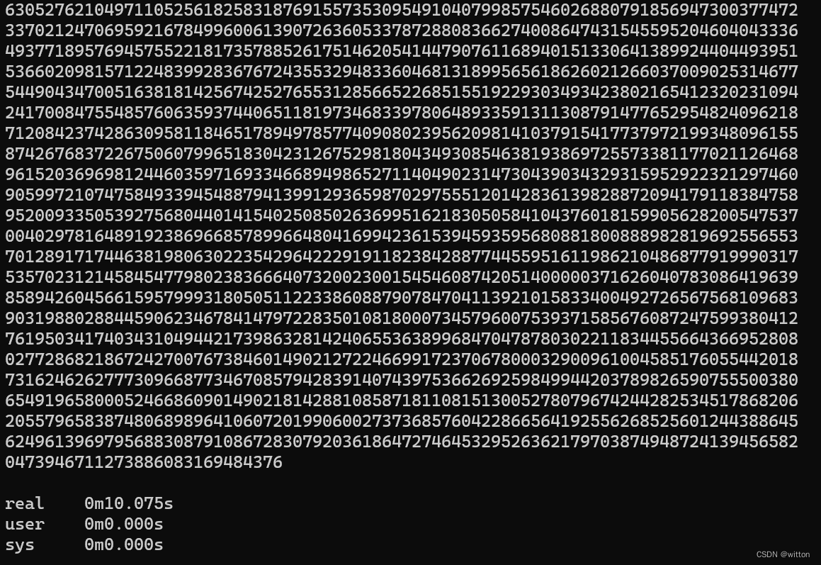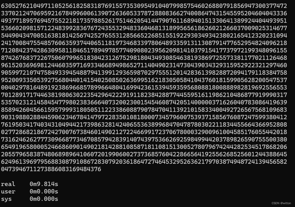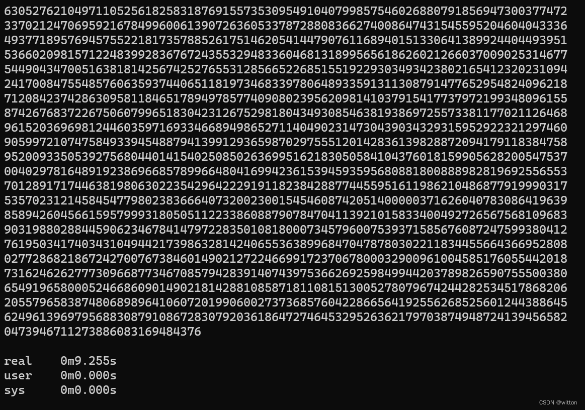 C# | 10.295秒 | dotnet run | 10.075秒 | time dotnet run | 9.255秒 | time ./ConsoleApp |