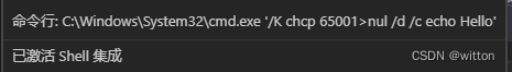 VSCode实际执行的指令为:C:\Windows\System32\cmd.exe '/K chcp 65001>nul /d /c echo Hello'