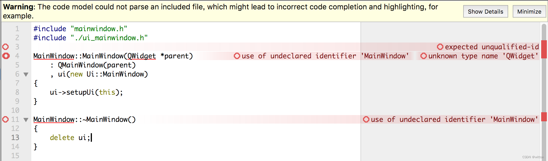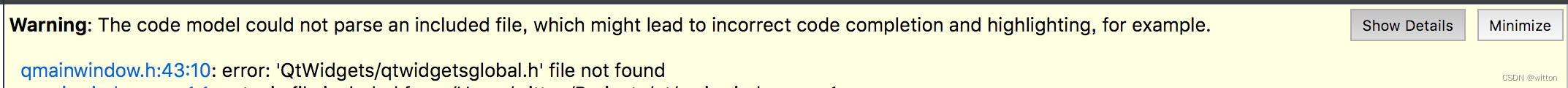 Warning: The code model could not parse an included file, which might lead to incorrect code completion and highlighting, for example.