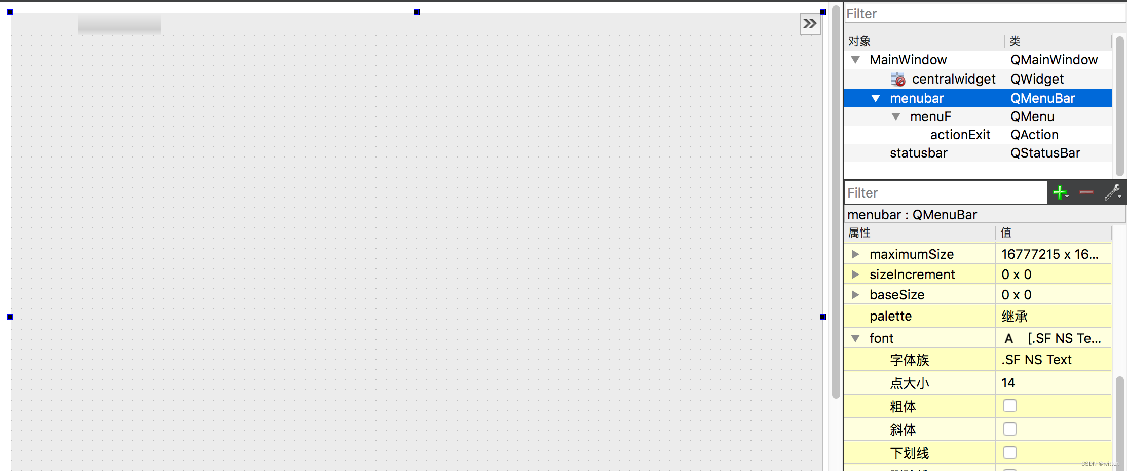 的,但是在界面设计器中显示不出来,而且菜单设计栏最右边出现了一个双箭头按钮,这是因为菜单的默认字体太大了,笔者的默认为14号字体。