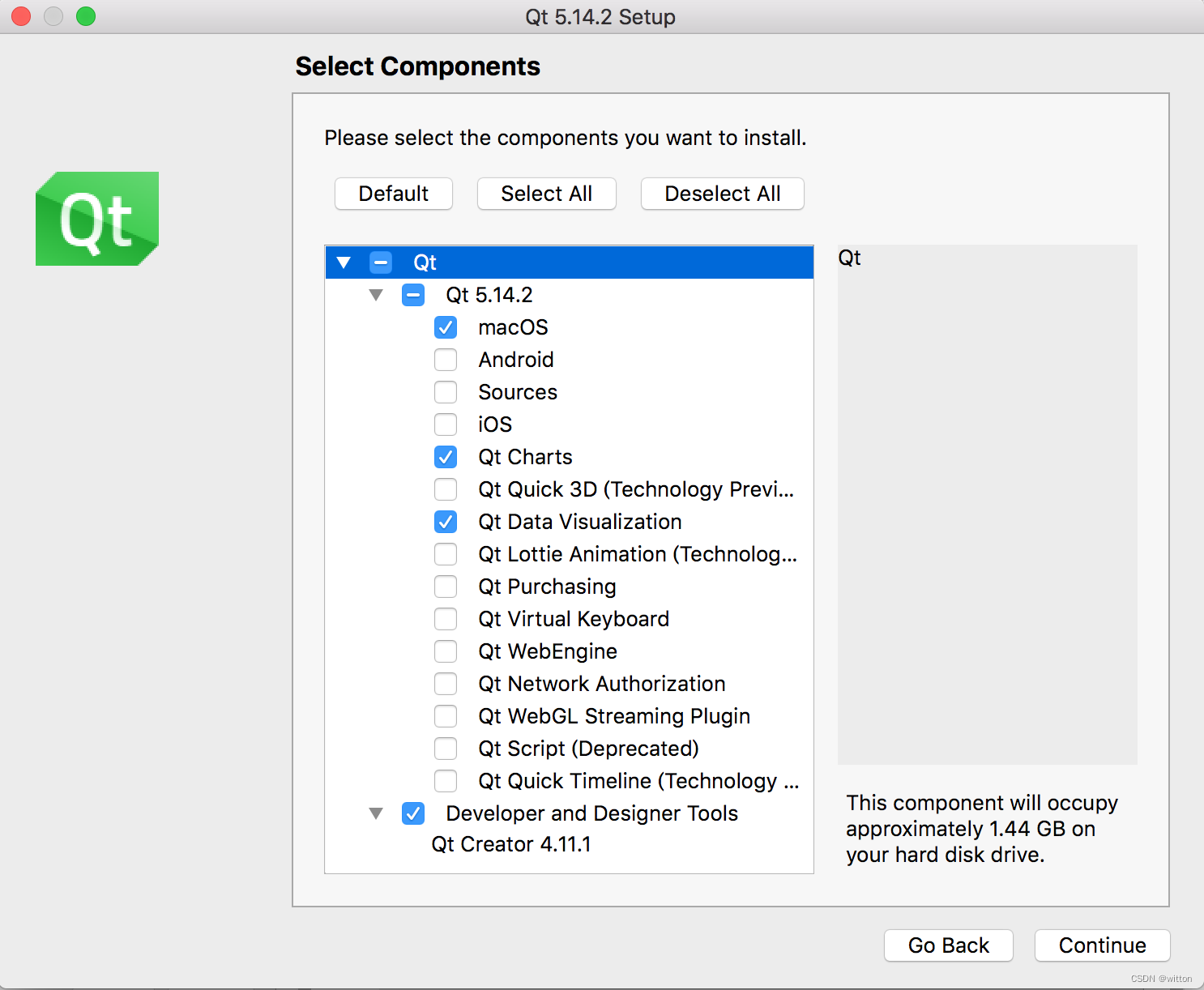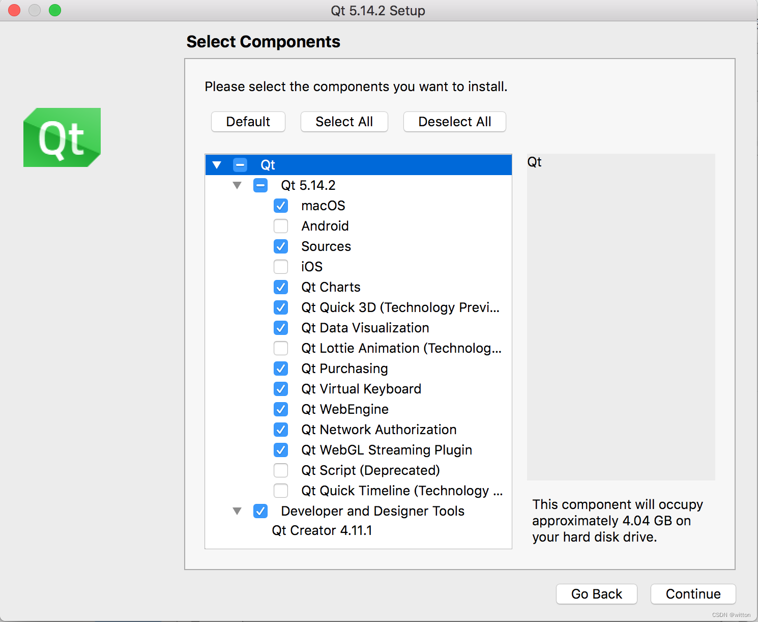 笔者使用的是MacOS 10.13.6和MacOS 10.15.7,前者为MBP笔记本,后者为虚拟机。笔者之前在虚拟机中安装过Qt5.14.2,在使用过程中并没出现最近遇到的问题,但最近在MBP笔记本中安装Qt5.14.2却出现了以下问题: