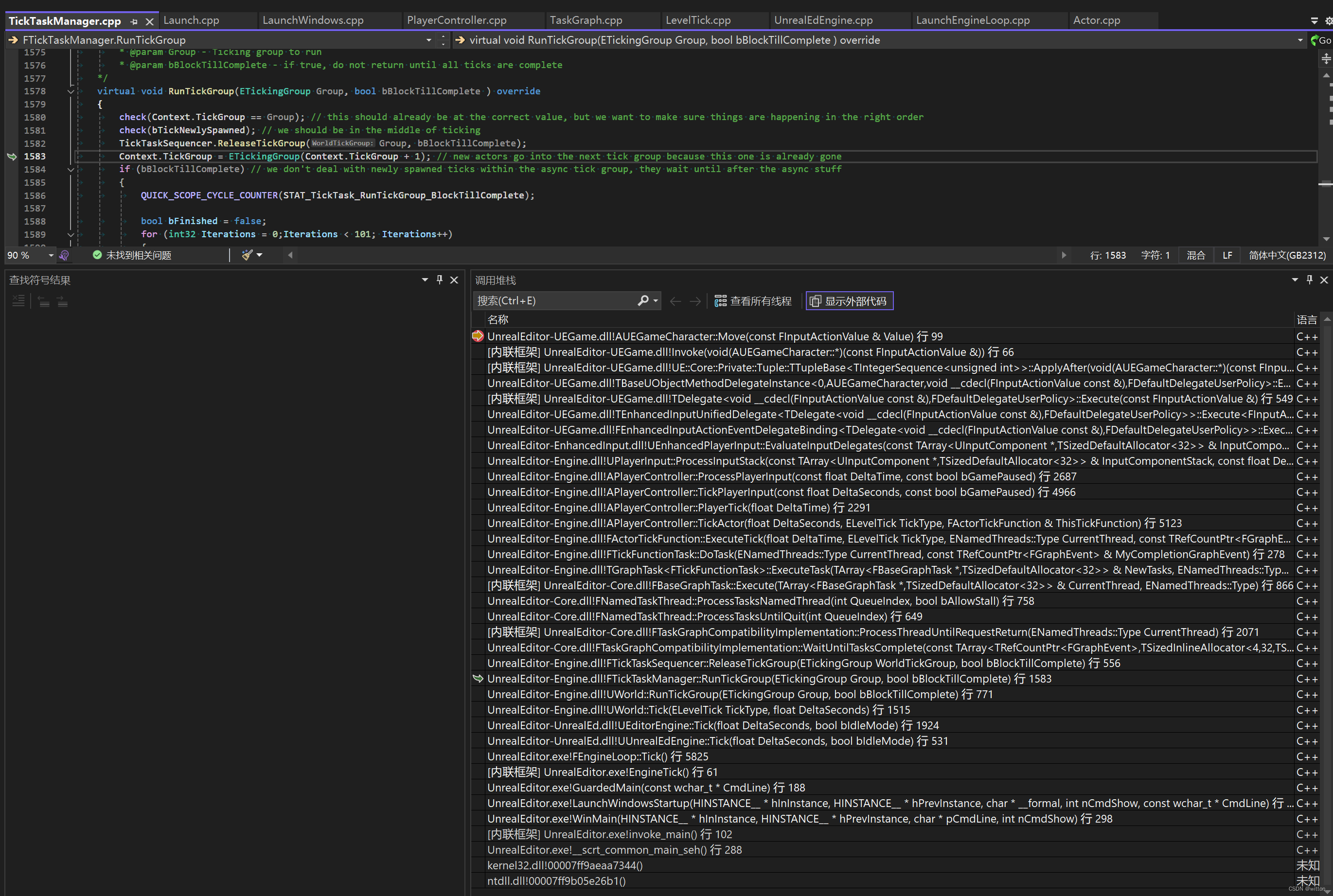 由于可以自行完全编译整个引擎代码,所以创建的新游戏,可以在VS2022中调试引擎代码: