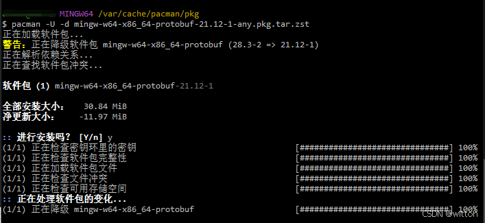 3警告:正在降级软件包 mingw-w64-x86_64-protobuf (28.3-2 => 21.12-1)