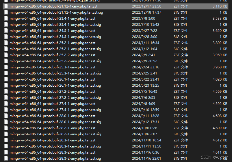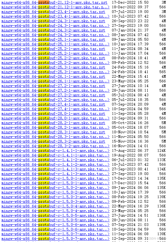 如果本机没有protobuf 21版本的安装包,可以去官网 https://repo.msys2.org/mingw/mingw64/看看是否还保留有此版本,目前还有此版本: