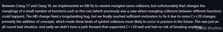 笔者在遇到问题时,喜欢知其然,也要尽量知其所以然!笔者查了一下资料,Clang编译器从18开始为了更好地支持C++20,对ABI进行了一些修改,特别是概念相关的命名冲突,就导致了一些函数的ABI发生了变化, 原文如下: