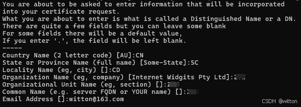 如果不想交互输入证书的国家,城市,组织名等等信息,可以在上面的命令加上参数:-subj "/CN=*"