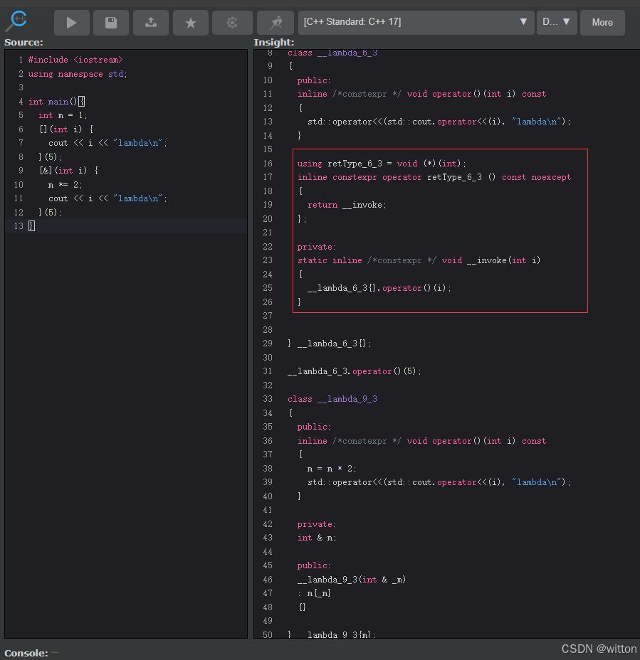 有一个网站 https://cppinsights.io/可以直观地看到C++内部可能的实现,前面的lambda表达式实际为类似这样的类: