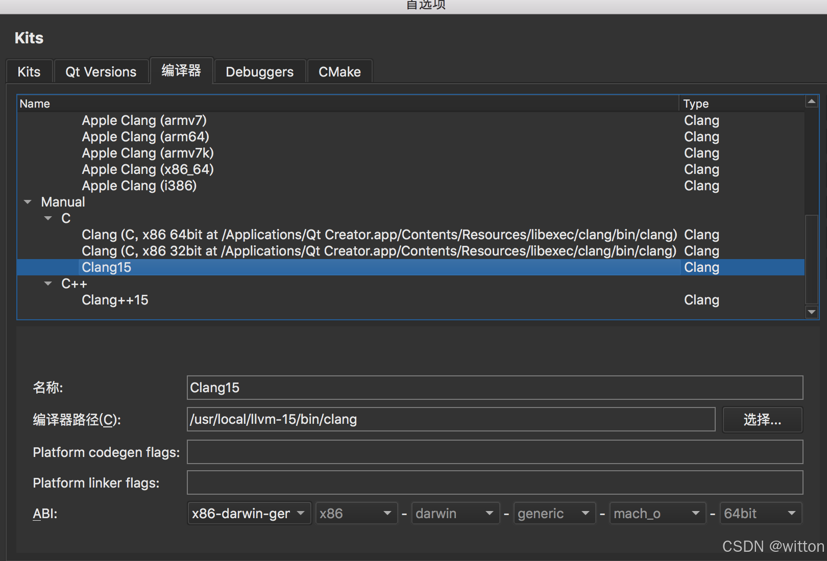 可以先使用QtCreator的自动检测,看是否能检测到Clang15,如果不能,手动添加: