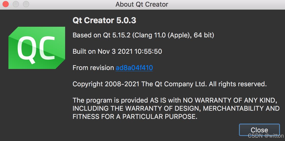 笔者在MBP上安装的是QtCreator 5.03版本,基于Qt5.15.2的: