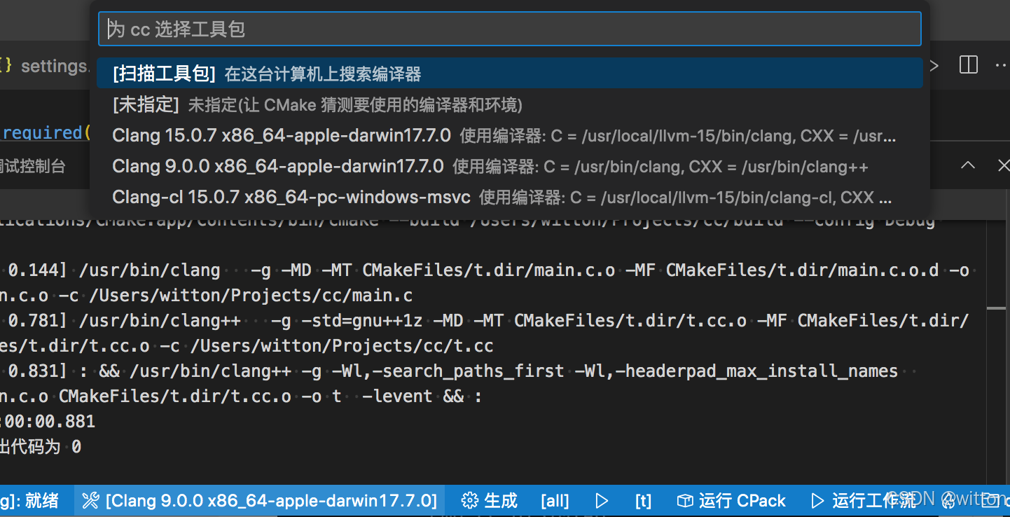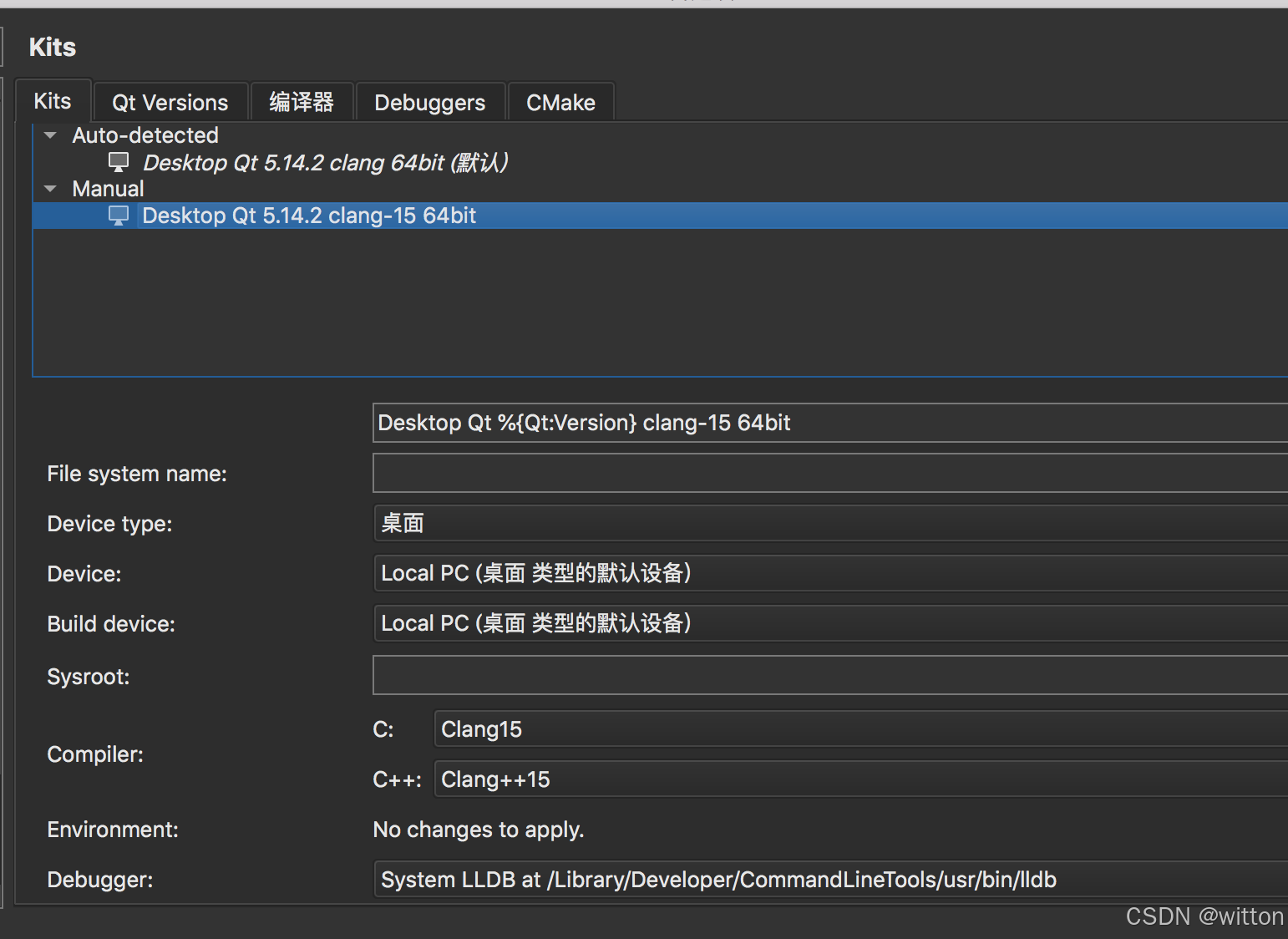 在Kits中克隆一个原来的配置,将下面的C/C++编译器设置为clang 15: