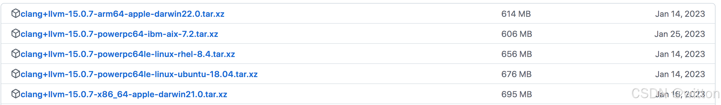 只可惜笔者的MBP系统太老,不能安装最新版本的,只能退而求其次,安装LLVM 15.0.7,而且有Intel CPU的x86_64版本: