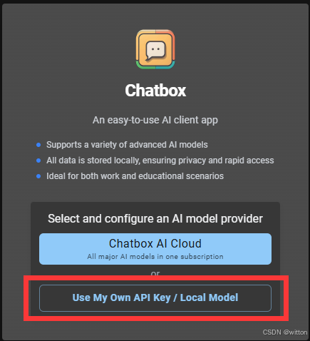 启动后,如果没设置过模型,就会要求设置模型,选择Use My Own API Key/Local Model