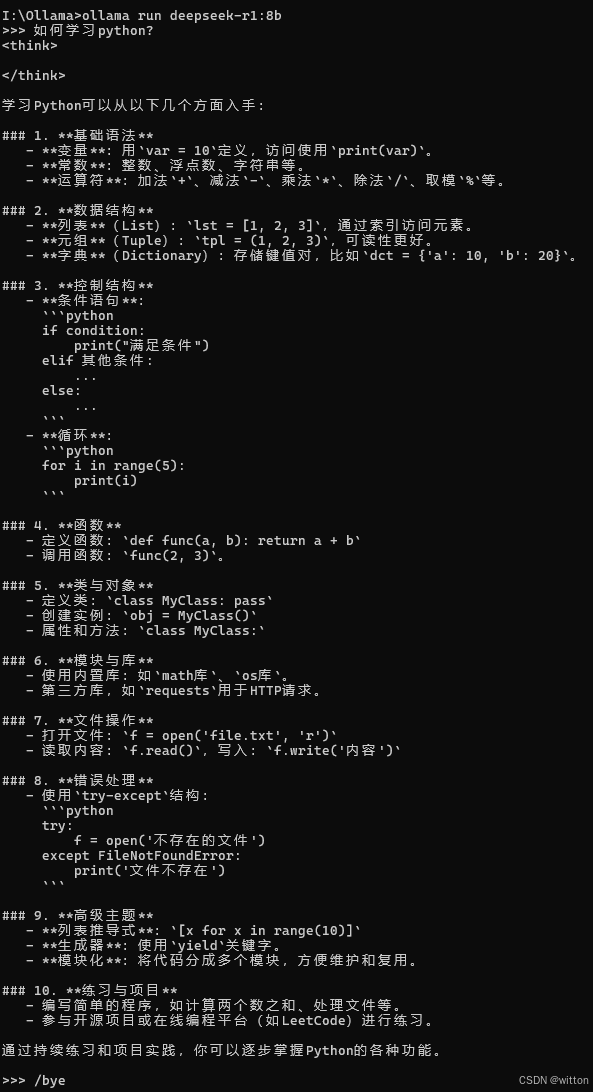 提示符后面输入问题,DeepSeek便开始思考并作答,作答格式是采用的Markdown的文本格式,如果要退出DeepSeek控制台,只需要在提示符后面输入指令:/byte
