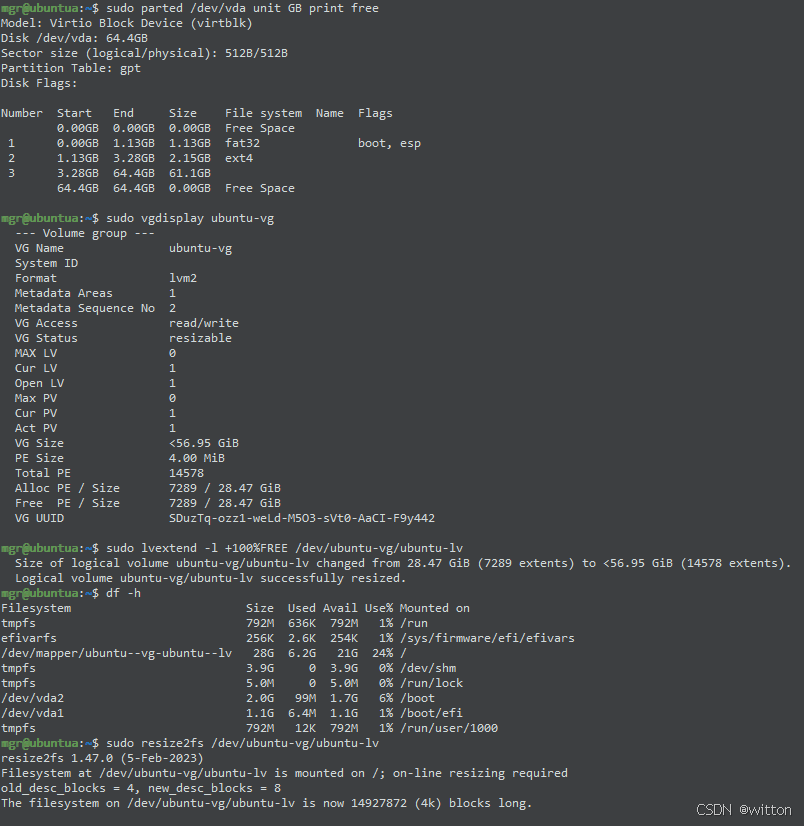 2 Size of logical volume ubuntu-vg/ubuntu-lv changed from 28.47 GiB (7289 extents) to <56.95 GiB (14578 extents).